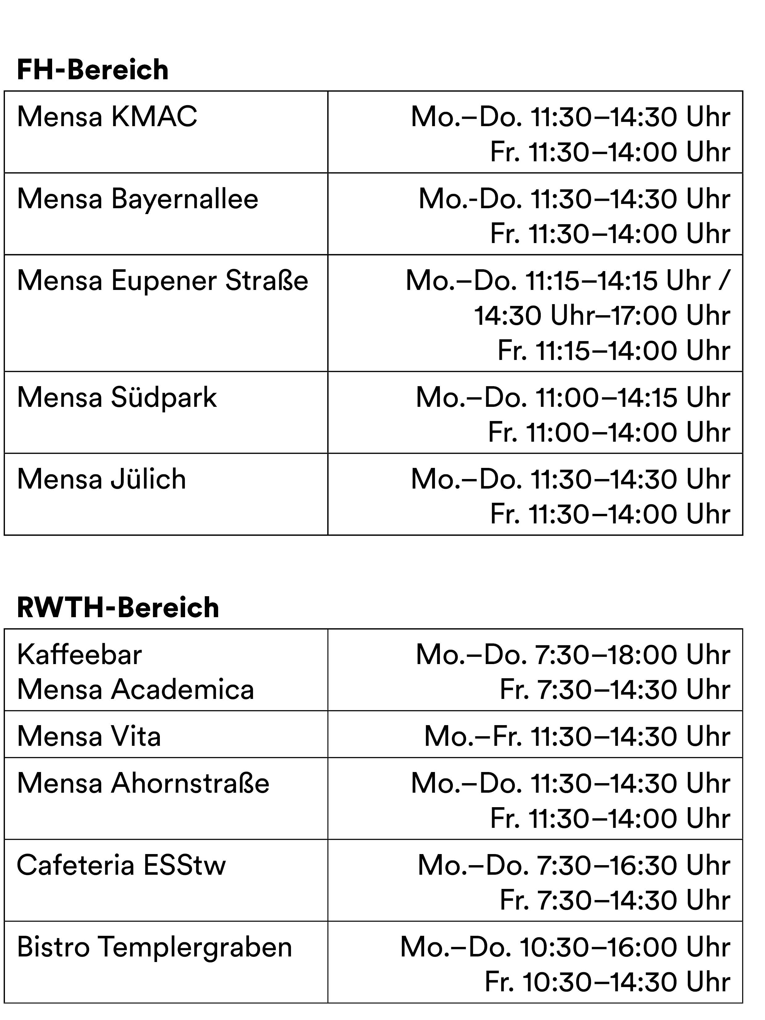 Die Öffnungszeiten der Mensa Academica, Mensa Ahornstraße und Mensa Vita bleiben bestehen.