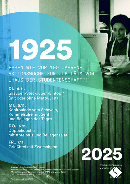 Unter dem Motto „Essen wie vor 100 Jahren“ servieren wir in unseren Mensen vom 4. bis 7. November typische Speisen von früher. Unsere Aktionswoche würdigt die bewegte Geschichte dieses Hauses und bringt kulinarische Klassiker der Vergangenheit zurück auf den Speiseplan. Freuen dürfen sich die Gäste auf Gerichte, wie sie in den 1920er Jahren auf den Tisch kamen – deftig und mit ganz viel Nostalgie!