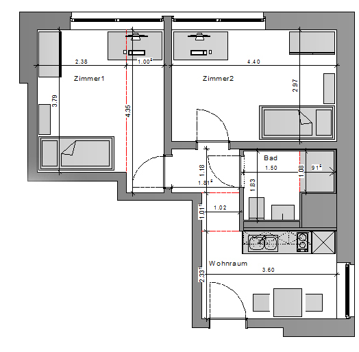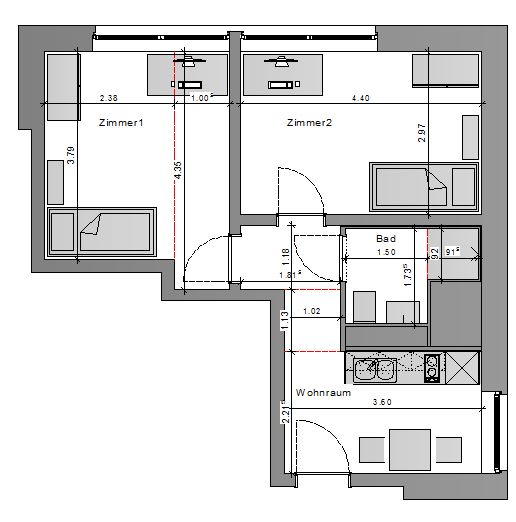 - voll ausgestattete Küchenzeile, Bad mit WC, Waschbecken und Dusche